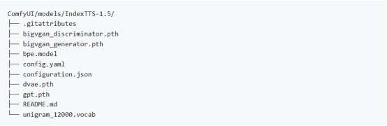 - 将模型文件放置在ComfyUI/models/IndexTTS-1.5目录中(如果目录不存在,请创建)。
