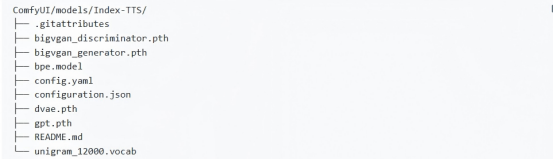 - 将模型文件放置在ComfyUI/models/Index-TTS目录中(如果目录不存在,请创建)。