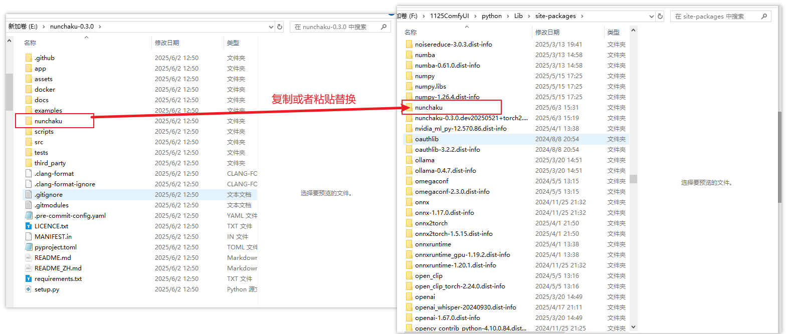 找到ComfyUI中python的的nunchaku环境包,然后使用上面下载的Source code文件夹中的nunchaku直接替换python环境包中的nunchaku文件夹。最后重启ComfyUI即可。