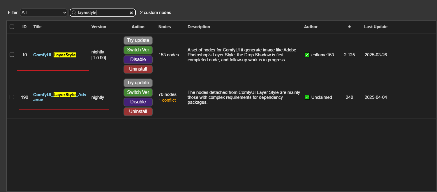 说明:最好将ComfyUI_LayerStyle插件和ComfyUI_LayerStyle_Advance插件都安装,都安装最新版。ComfyUI_LayerStyle_Advance插件是从ComfyUI_LayerStyle插件拆分出来的,新版本的ComfyUI_LayerStyle插件已经少了很多节点,且ComfyUI_LayerStyle_Advance更新了很多新节点。